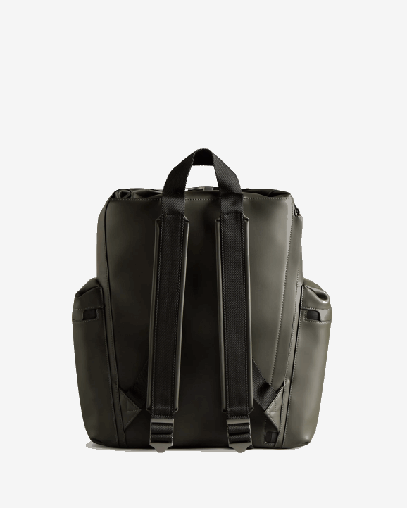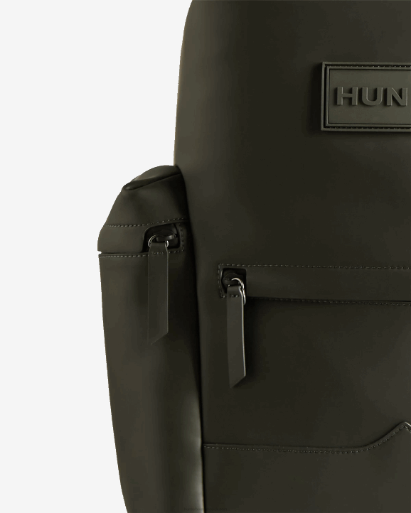 A practical, weatherproof backpack crafted from highly water-resistant rubberized leather that pays homage to 160 years of Hunter's weather protective innovation. This best-selling style in olive is secured with a parachute clip and zip at the top, while the moustache detail on the front references our iconic Original Tall Rain Boot. This spacious backpack has plenty of room for all the essentials with a depth of 11.5cm and a 20.6L capacity. An easy-access neoprene back pocket allows for safe storage of a 13.5" laptop while the adjustable padded straps offer increased comfort. This backpack is both timeless and functional.