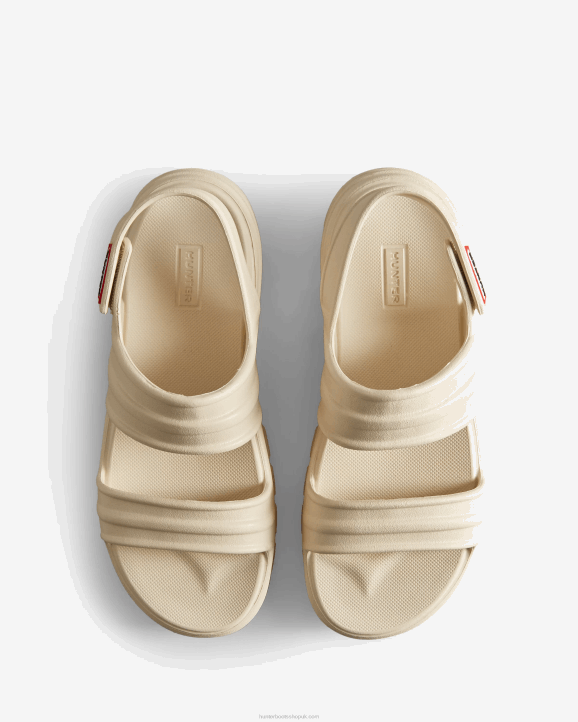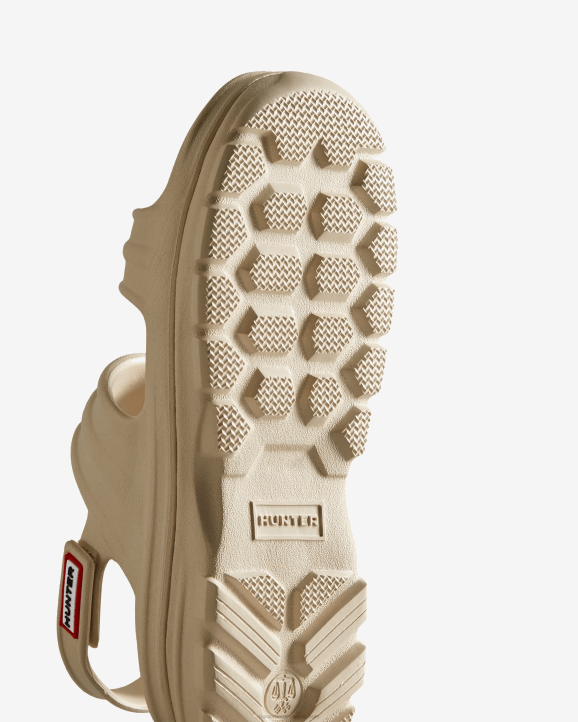 Protection, whether that's from the elements or of nature, is at the heart of Hunter. This season, we are excited to introduce a revolutionary new material produced from algae. When algae grows in excess, it can be harmful to ecosystems, so the algae in this material was sourced by cleaning up natural waterways. Our new Women's BLOOM Sandal is crafted from a blend of our familiar lightweight blown EVA and this innovative material. This cream sporty sandal from our injection moulded summer footwear range has adjustable straps and a chunky, durable tread for extra grip on all-terrains.