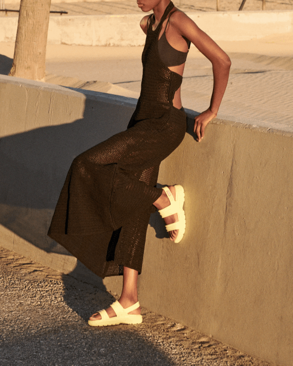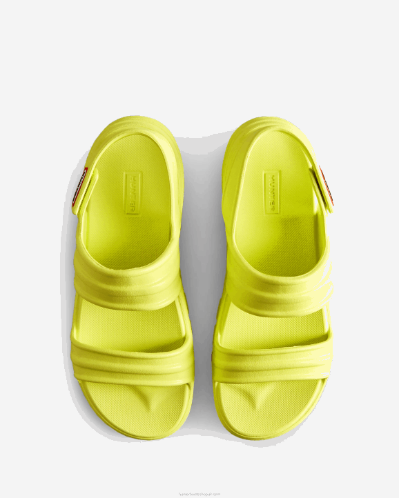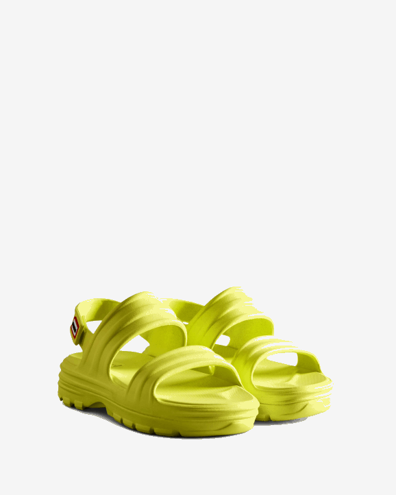 Protection, whether that's from the elements or of nature, is at the heart of Hunter. This season, we are excited to introduce a revolutionary new material produced from algae. When algae grows in excess, it can be harmful to ecosystems, so the algae in this material was sourced by cleaning up natural waterways. Our new Women's BLOOM Sandal is crafted from a blend of our familiar lightweight blown EVA and this innovative material. This yellow sporty sandal from our injection moulded summer footwear range has adjustable straps and a chunky, durable tread for extra grip on all-terrains.