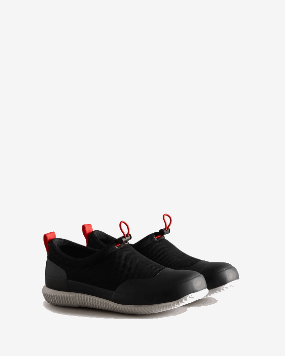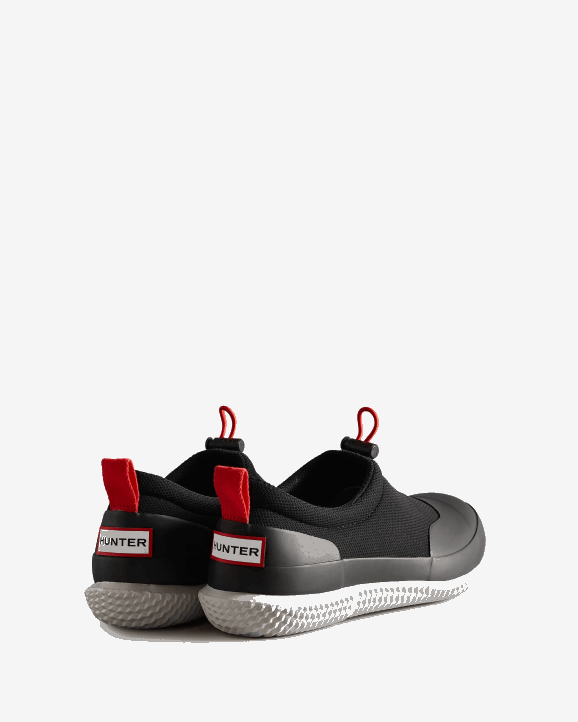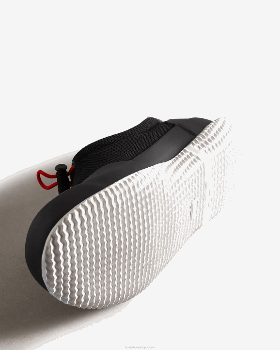 Engineered with an Original Hunter moulded rubber outsole for exceptional grip, these Mesh shoes provide comfort and stability on outdoor excursions. Designed for a full day's wear, these shoes have a neoprene and natural rubber construction with a mesh lining for breathability on the hottest days of the year as well as an Ortholite footbed, which acts like memory foam for the sole. These black and white slip-on water shoes are equipped with a contrast red pull tab for ease of entry and a drawcord for adjusting the fit.