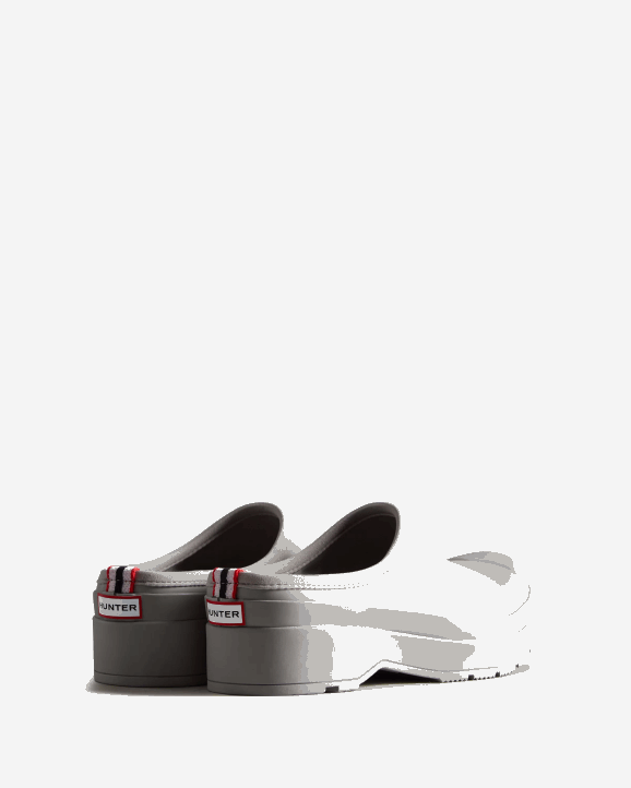 The slip-on Men's PLAY Clog is made from the highest quality natural rubber and set on a platformed sole with an updated 100% recycled polyester lining and insole. The 100% waterproof Clog is engineered with over 160-years of Hunter's all-weather intelligence. Evocative of the bestselling PLAY Boot, this light grey matte-finished welly clog features a streamlined silhouette and can be worn indoors for easy protection or outdoors as a summer slip-on in the warmer months