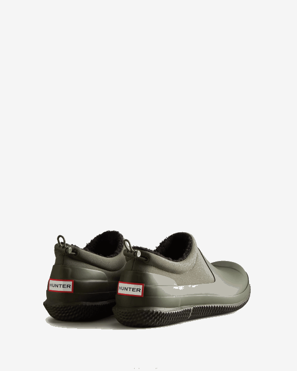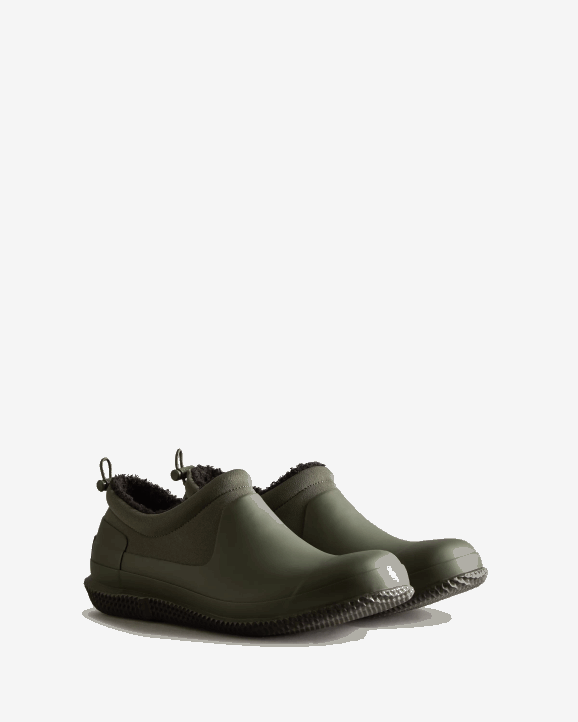 Take on the cold with these warm and snug slipper shoes. Merging two technical materials, the Original Vegan Shearling Shoe is handcrafted from natural rubber and insulating neoprene and is contructed with a comfortable Ortholite footbed. An icon to the Hunter family, the 100% waterproof men's Vegan Shearling Shoe is equipped with a firm grip perfect for slippery winter days. Featuring a draw-cord, Vegan Shearling fleece lining and a thermal insulated sole, they can be worn in temperatures as low as -5degrees (23degrees Fahrenheit). In a stylish tonal dark olive, choose this clog for your next frosty outing, morning dog walk or simply as a toasty pair of slippers for nights in.